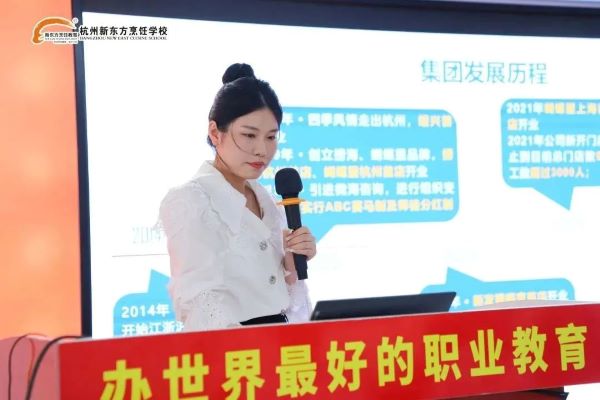 钱江源餐饮有限公司、浙江华味餐饮管理有限公司分别上台介绍公司发展史、品牌价值、荣誉奖状等。让同学们能对公司有一个更加深入地了解,明确学习目标与发展方向,更有针对性的培养专业技术能力,做到为企业所用、为社会所需。
