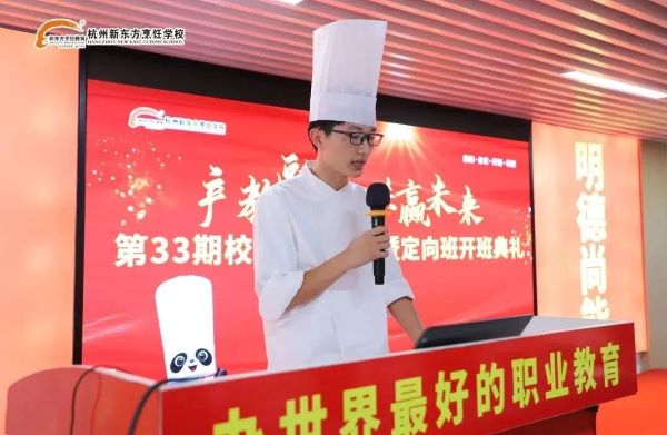 首先,校长助理石玉亮发表致辞,与同学们深入讲述班级培养模式,并表达了对同学们的希冀,提出要安心学习勤于思考,珍惜机会严守纪律,加强交流增进了解,为杭州新东方的学子就业贡献力量,为中国餐饮业发展培养更多厨师精英而努力奋斗!